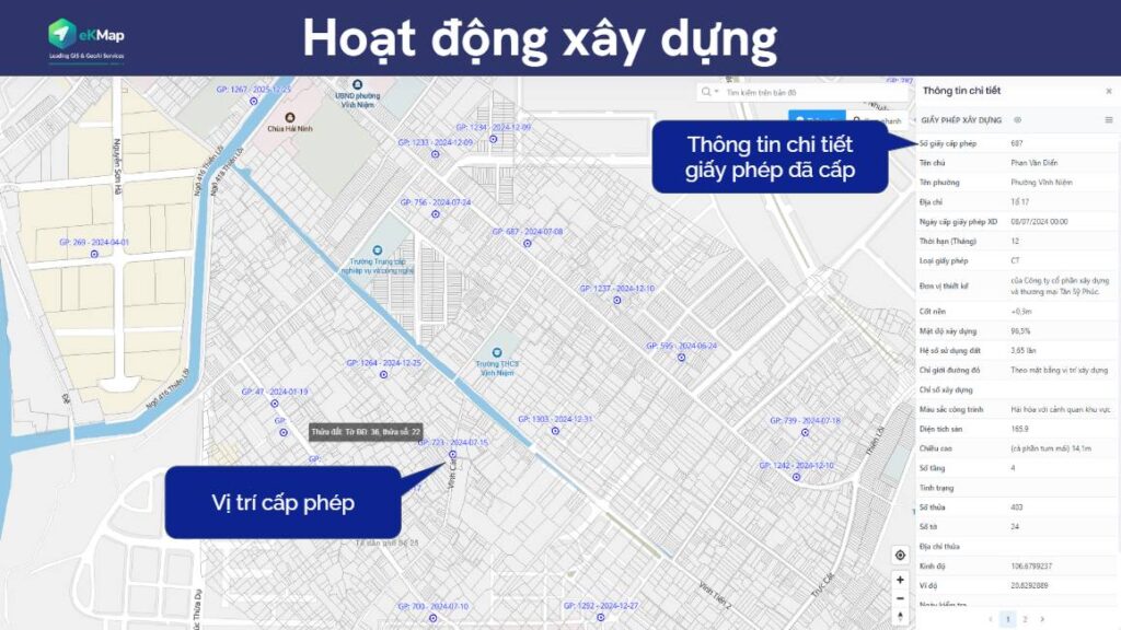 • Quản lý Cấp phép Xây dựng: Lớp bản đồ này thể hiện vị trí các công trình đã được cấp phép. Thông tin chi tiết kèm theo bao gồm số giấy phép, chủ đầu tư, quy mô, thời gian cấp, và bản vẽ thiết kế (được liên kết hồ sơ).