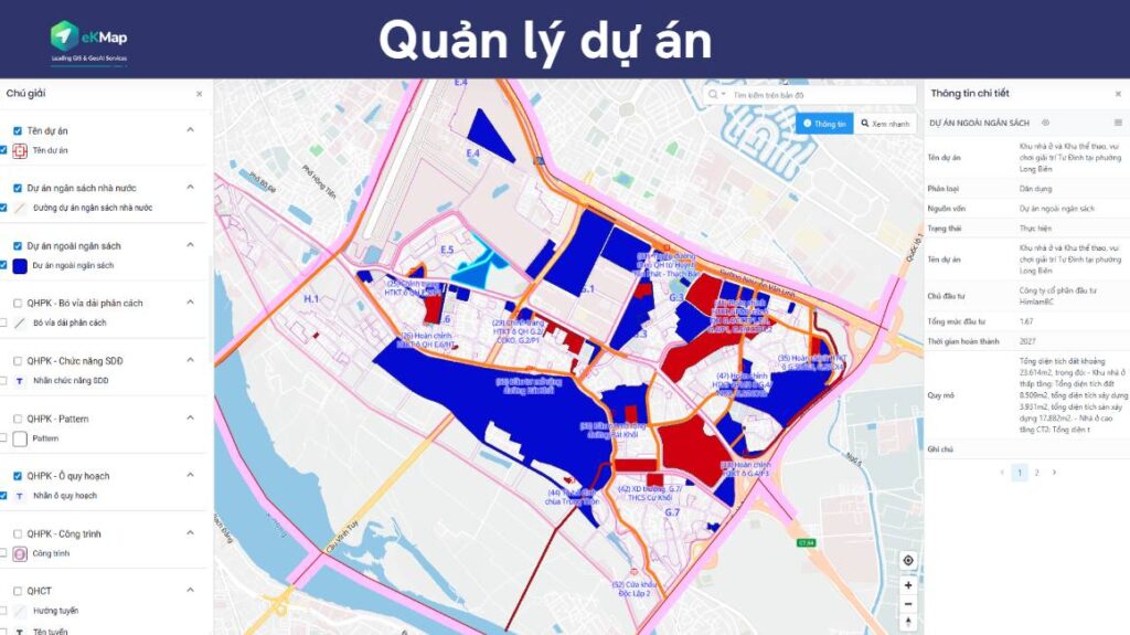 • Cập nhật Đồng bộ: Dễ dàng cập nhật trạng thái, thông tin dự án và liên kết hồ sơ dự án với vị trí cụ thể trên bản đồ.